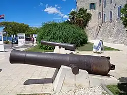 Later on, large cannons were known as bombards, ranging from three to five feet in length and were used by Dubrovnik and Kotor in defence during the later 14th century. The first bombards were made of iron, but bronze became more prevalent as it was recognized as more stable and capable of propelling stones weighing as much as 45 kilograms (99 lb). Around the same period, the Byzantine Empire began to accumulate its own cannon to face the Ottoman Empire, starting with medium-sized cannon 3 feet (0.91 m) long and of 10 in calibre.[77] The earliest reliable recorded use of artillery in the region was against the Ottoman siege of Constantinople in 1396, forcing the Ottomans to withdraw.[77] The Ottomans acquired their own cannon and laid siege to the Byzantine capital again in 1422. By 1453, the Ottomans used 68 Hungarian-made cannon for the 55-day bombardment of the walls of Constantinople, "hurling the pieces everywhere and killing those who happened to be nearby".[77] The largest of their cannons was the Great Turkish Bombard, which required an operating crew of 200 men[78] and 70 oxen, and 10,000 men to transport it.[77] Gunpowder made the formerly devastating Greek fire obsolete, and with the final fall of Constantinople—which was protected by what were once the strongest walls in Europe—on 29 May 1453, "it was the end of an era in more ways than one".[79]