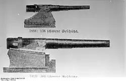 Cannons were used primarily as anti-infantry weapons until around 1374, when large cannons were recorded to have breached walls for the first time in Europe.[7] Cannons featured prominently as siege weapons. In 1464 a 16,000 kg (35,000 lb) cannon known as the Great Turkish Bombard was created in the Ottoman Empire.[8] Cannons as field artillery became more important after 1453 when cannons broke down the walls of the Roman Empire's capital, with the introduction of limber, which greatly improved cannon maneuverability and mobility.[9][10] European cannons reached their longer, lighter, more accurate, and more efficient "classic form" around 1480. This classic European cannon design stayed relatively consistent in form with minor changes until the 1750s.[11]