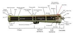 The cannon may have appeared as early as the 12th century in China,[1] and was probably a parallel development or evolution of the fire-lance, a short ranged anti-personnel weapon combining a gunpowder-filled tube and a polearm.[17] Projectiles such as iron scraps or porcelain shards, mixed together with the gunpowder ("co-viative"), were placed in fire lance barrels at some point,[18] and eventually, the paper and bamboo materials of fire lance barrels were replaced by metal.[19]