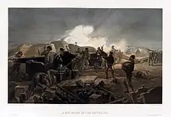 Cannons were crucial in Napoleon's rise to power, and continued to play an important role in his army in later years.[141] During the French Revolution, the unpopularity of the Directory led to riots and rebellions. When over 25,000 royalists led by General Danican assaulted Paris, Paul Barras was appointed to defend the capital; outnumbered five to one and disorganised, the Republicans were desperate.[142] When Napoleon arrived, he reorganised the defences but realised that without cannons the city could not be held. He ordered Joachim Murat to bring the guns from the Sablons artillery park; the Major and his cavalry fought their way to the recently captured cannons, and brought them back to Napoleon. When Danican's poorly trained men attacked, on 13 Vendémiaire 1795 (5 October in the calendar used in France at the time), Napoleon ordered his cannon to fire grapeshot into the mob,[143] an act that became known as the "whiff of grapeshot".[144] The slaughter effectively ended the threat to the new government, while, at the same time, making Bonaparte a famous—and popular—public figure.[143][145] Among the first generals to recognise that artillery was not being used to its full potential, Napoleon often massed his cannon into batteries and introduced several changes into the French artillery, improving it significantly and making it among the finest in Europe.[146][147] Such tactics were successfully used by the French, for example, at the Battle of Friedland, when 66 guns fired a total of 3,000 roundshot and 500 rounds of grapeshot,[146][148] inflicting severe casualties to the Russian forces, whose losses numbered over 20,000 killed and wounded, in total.[149] At the Battle of Waterloo—Napoleon's final battle—the French army had many more artillery pieces than either the British or Prussians. As the battlefield was muddy, recoil caused cannons to bury themselves into the ground after firing, resulting in slow rates of fire, as more effort was required to move them back into an adequate firing position;[150] also, roundshot did not ricochet with as much force from the wet earth.[151] Despite the drawbacks, sustained artillery fire proved deadly during the engagement, especially during the French cavalry attack.[152] The British infantry, having formed infantry squares, took heavy losses from the French guns, while their own cannons fired at the cuirassiers and lancers, when they fell back to regroup. Eventually, the French ceased their assault, after taking heavy losses from the British cannon and musket fire.[153]