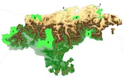 Furthermore, nine Sites of Community Importance (LIC[21]) have been declared: Western Mountain, Eastern Mountain, Western Rias and Oyambre Dunes, Dunes of Liencres and Estuary of the Pas, El Puntal Dunes and Estuary of the Miera, Ria de Ajo, Marshes of Noja-Santoña, Escudo de Cabuérniga Range and several caves with important bat colonies.