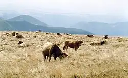 The principal rivers are the Alagnon, which is a tributary to the Allier; the Celle and Truyère, tributary to the Lot; and the Cère and Rhue, tributary to the Dordogne.[4] At an elevation of 250 meters (820 ft) above sea level, the low point of the province lies in the Lot valley. The Truyère valley skirts the Planèze on the south and divides it from the Monts d'Aubrac, whose foothills include the thermal springs of Chaudes-Aigues. The western area of the department consists of grassy plateaus and river valleys.[5]
