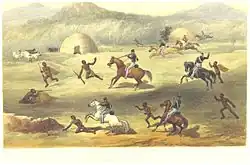 Many of the colonists who settled directly on the frontier became increasingly independent and localised in their loyalties.[13] Known as Boers, they migrated beyond the Cape Colony's initial borders and had soon penetrated almost a thousand kilometres inland.[14] Some Boers even adopted a nomadic lifestyle permanently and were denoted as trekboers.[15] The VOC colonial period had a number of bitter, genocidal conflicts between the colonists and the Khoe-speaking indigenes,[16] followed by the Xhosa, both of which they perceived as unwanted competitors for prime farmland.[15]