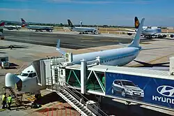 The terminal has 10 air bridges, evenly split between domestic and international usage. Sections of lower levels of the domestic and international terminals are used for transporting passengers via bus to and from remotely parked aircraft.[31]