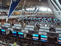 The terminal building has a split-level design, with departures located on the upper floors and arrivals in the lower floors; an elevated roadway system provides vehicular access to both departures and arrivals levels.[31] All check-in takes place within the Central Terminal Building, which contains 120 check-in desks and 20 self-service kiosks.[31]