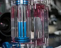 A practical application of capillary action is the capillary action siphon. Instead of utilizing a hollow tube (as in most siphons), this device consists of a length of cord made of a fibrous material (cotton cord or string works well). After saturating the cord with water, one (weighted) end is placed in a reservoir full of water, and the other end placed in a receiving vessel. The reservoir must be higher than the receiving vessel.[23] A related but simplified capillary siphon only consists of two hook-shaped stainless-steel rods, whose surface is hydrophilic, allowing water to wet the narrow grooves between them.[24] Due to capillary action and gravity, water will slowly transfer from the reservoir to the receiving vessel. This simple device can be used to water houseplants when nobody is home. This property is also made use of in the lubrication of steam locomotives: wicks of worsted wool are used to draw oil from reservoirs into delivery pipes leading to the bearings.[25]