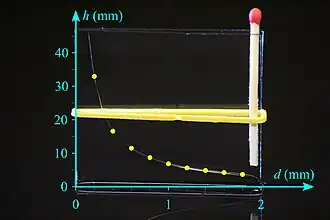 The product of layer thickness (d) and elevation height (h) is constant (d·h = constant), the two quantities are inversely proportional. The surface of the liquid between the planes is hyperbola.