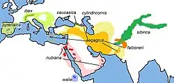 - ^ Kazanskaya, E. Y.; Kuznetsova, M. V.; Danilkin, A. A. (2007). "Phylogenetic reconstructions in the genus Capra (Bovidae, Artiodactyla) based on the mitochondrial DNA analysis". Russian Journal of Genetics. 43 (2): 181–189. doi:10.1134/S1022795407020135.