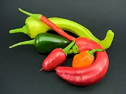 Capsicum (/ˈkæpsɪkəm/[3]) is a genus of flowering plants in the nightshade family Solanaceae, native to the Americas, cultivated worldwide for their edible fruit, which are generally known as "peppers" or "capsicum". Chili peppers grow on five species of Capsicum. Sweet or bell peppers and some chili peppers are Capsicum annuum, making it the most cultivated species in the genus.[4]