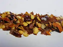 The generic name may come from Latin capsa, meaning 'box', presumably alluding to the pods;[8][9] or possibly from the Greek word κάπτω, kapto, 'to gulp'.[10] The name pepper comes from the similarity of piquance (spiciness or "heat") of the flavor to that of black pepper, Piper nigrum, although there is no botanical relationship with it or with Sichuan pepper. The original term chilli came from the Nahuatl word chīlli, denoting a larger Capsicum variety cultivated at least since 3000 BC.[7] Different varieties were cultivated in South America, where they are known as ajíes (singular ají), from the Quechua term for Capsicum.