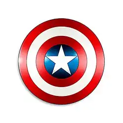 Captain America's shield is the character's primary piece of equipment. It is a round shield with a design featuring a white star on a blue circle surrounded by red and white rings. First appearing in Captain America Comics #1 as a triangular heater shield, beginning in Captain America Comics #2 it was changed to its current circular design due to a complaint from MLJ Comics that the original design too closely resembled the chest symbol of their superhero The Shield.[20] The shield is depicted as constructed from an alloy of vibranium and adamantium, two highly resilient fictional metals appearing in Marvel comic books. It is portrayed as both a virtually indestructible defensive object and a highly aerodynamic offensive weapon: when thrown, it is capable of ricocheting off multiple surfaces and returning to the original thrower.[110]