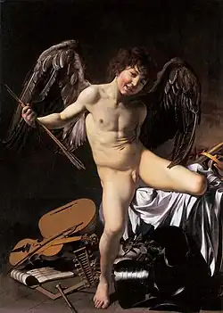 Amor Vincit Omnia, 1601–1602, Gemäldegalerie, Berlin. Caravaggio shows Cupid prevailing over all human endeavors: war, music, science, government.
