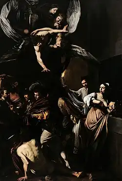 His first version of Saint Matthew and the Angel, featuring the saint as a bald peasant with dirty legs attended by a lightly clad over-familiar boy-angel, was rejected and a second version had to be painted as The Inspiration of Saint Matthew. Similarly, The Conversion of Saint Paul was rejected, and while another version of the same subject, the Conversion on the Way to Damascus, was accepted, it featured the saint's horse's haunches far more prominently than the saint himself, prompting this exchange between the artist and an exasperated official of Santa Maria del Popolo: "Why have you put a horse in the middle, and Saint Paul on the ground?" "Because!" "Is the horse God?" "No, but he stands in God's light!"[27]