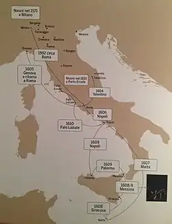 Modern accounts are to be found in Peter Robb's M and Helen Langdon's Caravaggio: A Life. A theory relating the death to Renaissance notions of honour and symbolic wounding has been advanced by art historian Andrew Graham-Dixon.[44] Whatever the details, the matter was serious enough that Caravaggio was forced to flee Rome.[45][46] He moved just south of the city, then to Naples, Malta, and Sicily.