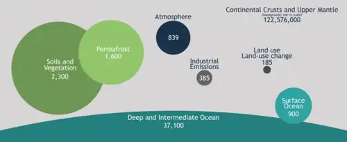 Diagram showing relative sizes (in gigatonnes) of the main storage pools of carbon on Earth. Cumulative changes (thru year 2014) from land use and emissions of fossil carbon are included for comparison.[20]