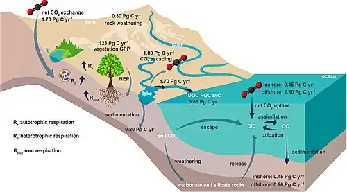 Riverine transport, being the main connective channel of these pools, will act to transport net primary productivity (primarily in the form of dissolved organic carbon (DOC) and particulate organic carbon (POC)) from terrestrial to oceanic systems.[73] During transport, part of DOC will rapidly return to the atmosphere through redox reactions, causing "carbon degassing" to occur between land-atmosphere storage layers.[74][75] The remaining DOC and dissolved inorganic carbon (DIC) are also exported to the ocean.[76][77][78] In 2015, inorganic and organic carbon export fluxes from global rivers were assessed as 0.50–0.70 Pg C y−1 and 0.15–0.35 Pg C y−1 respectively.[77] On the other hand, POC can remain buried in sediment over an extensive period, and the annual global terrestrial to oceanic POC flux has been estimated at 0.20 (+0.13,-0.07) Gg C y−1.[79][72]