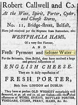 In the United States, plain carbonated water was generally known either as soda water, due to the sodium salts it contained, or seltzer water, deriving from the German town Selters renowned for its mineral springs.[37]