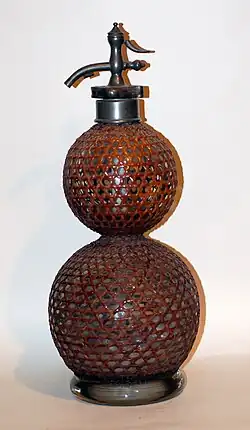 The gasogene (or gazogene, or seltzogene) is a late Victorian device for producing carbonated water. It consists of two linked glass globes: the lower contained water or other drink to be made sparkling, the upper a mixture of tartaric acid and sodium bicarbonate that reacts to produce carbon dioxide. The produced gas pushes the liquid in the lower container up a tube and out of the device. The globes are surrounded by a wicker or wire protective mesh, as they have a tendency to explode.[38]