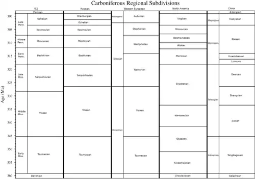 The similarity in successions between the British Isles and Western Europe led to the development of a common European timescale with the Carboniferous System divided into the lower Dinantian, dominated by carbonate deposition and the upper Silesian with mainly siliciclastic deposition.[17] The Dinantian was divided into the Tournaisian and Viséan stages. The Silesian was divided into the Namurian, Westphalian and Stephanian stages. The Tournaisian is the same length as the International Commission on Stratigraphy (ICS) stage, but the Viséan is longer, extending into the lower Serpukhovian.[16]