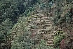 Much production of cardamom in India is cultivated on private property or in areas the government leases out to farmers.[18] Traditionally, small plots of land within the forests (called eld-kandies) where the wild or acclimatised plant existed are cleared during February and March. Brushwood is cut and burned, and the roots of powerful weeds are torn up to free the soil. Soon after clearing, cardamom plants spring up. After two years the cardamom plants may have eight-to-ten leaves and reach 30 cm (1 ft) in height. In the third year, they may be 120 cm (4 ft) in height.[19] In the following May or June the ground is again weeded, and by September to November a light crop is obtained. In the fourth year, weeding again occurs, and if the cardamoms grow less than 180 cm (6 ft) apart a few are transplanted to new positions. The plants bear for three or four years; and historically the life of each plantation was about eight or nine years. In Malabar the seasons run a little later than in Mysore, and – according to some reports – a full crop may be obtained in the third year. Cardamoms grown above 600 m (2,000 ft) elevation are considered to be of higher quality than those grown below that altitude.[19]