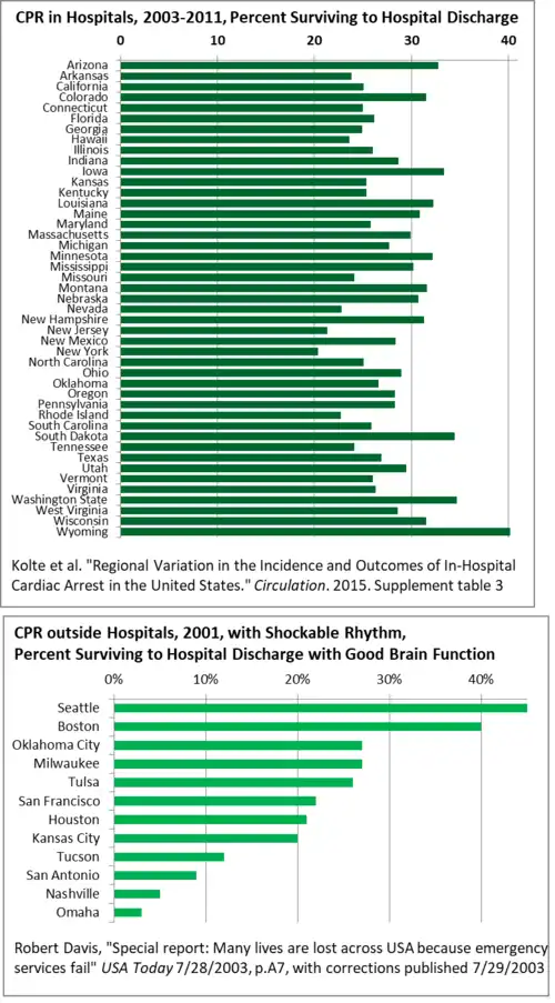 Studies have shown that immediate CPR followed by defibrillation within 3–5 minutes of sudden VF cardiac arrest dramatically improves survival. In cities such as Seattle where CPR training is widespread and defibrillation by EMS personnel follows quickly, the survival rate is about 20 percent for all causes and as high as 57 percent for a witnessed "shockable" arrest.[81] In cities such as New York, without those advantages, the survival rate is only 5 percent for witnessed shockable arrest.[82] Similarly, in-hospital CPR is more successful when arrests are witnessed, occur in the ICU, or occur in patients wearing heart monitors.[83][84]