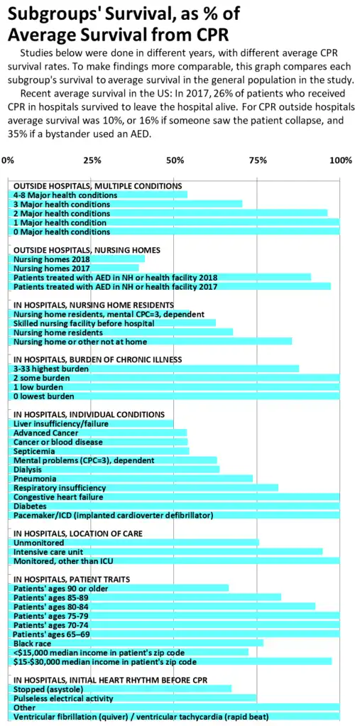 137. ^ a b c d Abbo ED, Yuen TC, Buhrmester L, Geocadin R, Volandes AE, Siddique J, et al. (January 2013). "Cardiopulmonary resuscitation outcomes in hospitalized community-dwelling individuals and nursing home residents based on activities of daily living". Journal of the American Geriatrics Society. 61 (1): 34–39. doi:10.1111/jgs.12068. PMID 23311551. S2CID 36483449.