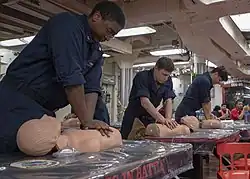 CPR involves chest compressions for adults between 5 cm (2.0 in) and 6 cm (2.4 in) deep and at a rate of at least 100 to 120 per minute.[2] The rescuer may also provide artificial ventilation by either exhaling air into the subject's mouth or nose (mouth-to-mouth resuscitation) or using a device that pushes air into the subject's lungs (mechanical ventilation). Current recommendations emphasize early and high-quality chest compressions over artificial ventilation; a simplified CPR method involving only chest compressions is recommended for untrained rescuers.[3] With children, however, 2015 American Heart Association guidelines indicate that doing only compressions may result in worse outcomes, because such problems in children normally arise from respiratory issues rather than from cardiac ones, given their young age.[1] Chest compression to breathing ratios are set at 30 to 2 in adults.