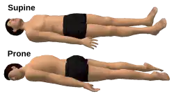 Standard CPR is performed with the victim in supine position. Prone CPR, or reverse CPR, is performed on a victim in prone position, lying on the chest. This is achieved by turning the head to the side and compressing the back. Due to the head being turned, the risk of vomiting and complications caused by aspiration pneumonia may be reduced.[48]