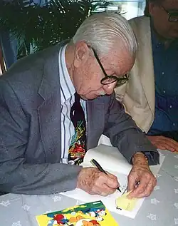 Carl Barks (March 27, 1901 – August 25, 2000) was an American cartoonist, author, and painter. He is best known for his work in Disney comic books, as the writer and artist of the first Donald Duck stories and as the creator of Scrooge McDuck. He worked anonymously until late in his career; fans dubbed him "The Duck Man" and "The Good Duck Artist". In 1987, Barks was one of the three inaugural inductees of the Will Eisner Comic Book Hall of Fame.[2]