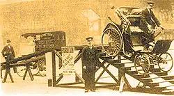The Motorwagen was patented on 29 January 1886 as DRP-37435: "automobile fueled by gas".[19] The 1885 version was difficult to control, leading to a collision with a wall during a public demonstration. The first successful tests on public roads were carried out in the early summer of 1886. Benz first publicly drove the car on 3 July 1886 in Mannheim at a top speed of 16 km/h (10 mph).[2] The next year Benz created the Motorwagen Model 2, which had several modifications, and in 1889, the definitive Model 3 with wooden wheels was introduced, showing at the Paris Expo the same year.[18]
