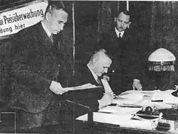 In April 1938, Goerdeler visited London, where he advised the British government both to resist the Nazi claim to the Sudetenland area of Czechoslovakia and to declare that he wanted to see the area transferred to Germany as soon as possible.[48] As Gerhard Weinberg observed, Goerdeler's contradictory statements left the British somewhat confused.[48] In the spring of 1938, Goerdeler, in association with Hans von Dohnanyi, Colonel Hans Oster and Johannes Popitz, became involved in planning a putsch against the Nazi regime should the regime launch Fall Grün, the codename for the invasion of Czechoslovakia.[49] In June 1938, Beck often consulted with Goerdeler over the question of whether or not he should resign as Chief of the General Staff as a way of stopping Fall Grün.[50]