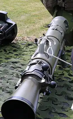 The basic weapon consists of the main tube with the breech-mounted Venturi recoil damper, with two grips near the front and a shoulder mount.[16] The weapon is fitted with iron sights, but is normally aimed with the attached 3× optical sight with a 17 degree (300 mil) field of view. The most modern variants fielded by Swedish rifle companies have been fitted with the Swedish Aimpoint sighting system. Luminous front and rear sight inserts are available for the iron sights when aiming at night, and an image intensification system may also be used.