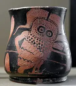 Oinochoe depicting the parade of an armed owl during the celebration of the Anthesteria (Greece, 410–390 BC)