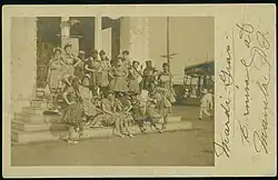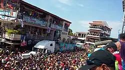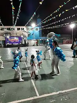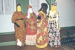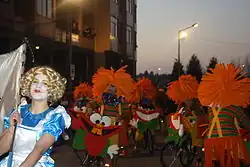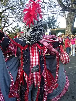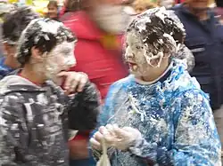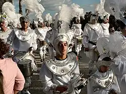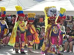 Comparsas are held throughout the week, consisting of large groups "of dancers dancing and traveling on the streets, followed by a Carrosa (carriage) where the musicians play. The Comparsa is a development of African processions where groups of devotees follow a given saint or deity during a particular religious celebration." One of the most popular comparsas of Fiesta de Carnaval is the male group comparsa, usually composed of notable men from the community who dress up in outlandish costumes or cross-dress and dance to compete for money and prizes.[67] Other popular activities include body painting and flour fighting.[68][69] "On the last day of Carnival painters flood the street to paint each other. This simply means that a mixture of water paint and water or raw eggs is used to paint people on the streets, the goal being to paint as many people as you can."[67]