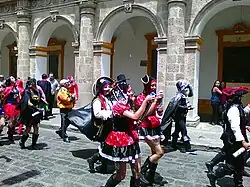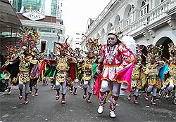 La Diablada Carnival takes place in Oruro in central Bolivia. It is celebrated in honor of the miners' patron saint, Vírgen de Socavon (the Virgin of the Tunnels).[71] Over 50 parade groups dance, sing, and play music over a five kilometre-long course. Participants dress up as demons, devils, angels, Incas, and Spanish conquistadors. Dances include caporales and tinkus. The parade runs from morning until late at night, 18 hours a day, for three days before Ash Wednesday. It was declared the 2001 "Masterpieces of Oral Heritage and Intangible Heritage of Humanity" by UNESCO.[72] Throughout the country, celebrations are held involving traditional rhythms and water parties. In Santa Cruz de la Sierra, on the east side of the country, tropical weather allows a Brazilian-type Carnival, with Comparsas dancing traditional songs in matching uniforms.[73]