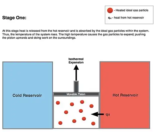 1. Isothermal expansion. Heat (as an energy) is transferred reversibly from the hot temperature reservoir at constant temperature TH to the gas at a temperature infinitesimally less than TH. (The infinitesimal temperature difference allows the heat to transfer into the gas without a significant change in the gas temperature. This is called isothermal heat addition or absorption.) During this step (1 to 2 on Figure 1), the gas is in thermal contact with the hot temperature reservoir, and is thermally isolated from the cold temperature reservoir. The gas is allowed to expand, doing work on the surroundings by pushing up the piston (Stage One figure, right). Although the pressure drops from points 1 to 2 (figure 1) the temperature of the gas does not change during the process because the heat transferred from the hot temperature reservoir to the gas is exactly used to do work on the surroundings by the gas. There is no change in the gas internal energy, and no change in the gas temperature. Heat QH > 0 is absorbed from the hot temperature reservoir.