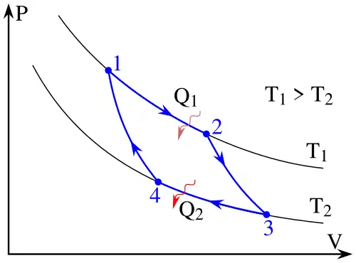 Figure 1: A Carnot cycle illustrated on a PV diagram to illustrate the work done. 1-to-2 (isothermal expansion), 2-to-3 (adiabatic expansion), 3-to-4 (isothermal compression), 4-to-1 (adiabatic compression).