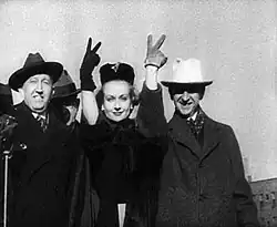 While continuing with a slower work-rate, Lombard decided to move away from comedies and return to dramatic roles.[107] She appeared in Made for Each Other (1939) with James Stewart playing a couple facing domestic difficulties.[108] Reviews for the film were highly positive, and praised Lombard's dramatic effort; financially, it was a disappointment.[109] Lombard's next appearance came with Cary Grant in the John Cromwell romance In Name Only (1939), a credit she personally negotiated with RKO Radio Pictures upon hearing of the script and Grant's involvement.[110] The role reflected her recent experiences, as she played a woman in love with a married man whose wife refuses to divorce. She was paid $150,000 for the film, continuing her status as one of Hollywood's highest-paid actresses, and it was a moderate success.[111] At the 12th Academy Awards ceremony in February 1940, Lombard was quoted as comforting Gable after his loss as Rhett Butler from Gone with the Wind, with the comment "Don't worry, Pappy. We'll bring one home next year". Gable replied that he felt this had been his last chance to which Lombard was said to have replied, "Not you, you self-centered bastard. I meant me."[112][113]