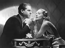 The next films in which Lombard appeared were Henry Hathaway's Now and Forever (1934), featuring Gary Cooper and the new child star Shirley Temple, and Lady by Choice (1934), which was a critical and commercial success. The Gay Bride (1934) placed her with Chester Morris in a gangster comedy, but it was panned by critics.[69] She reunited with George Raft for Rumba (1935) where she was given the opportunity to repeat the screwball success of Twentieth Century.[70] In Mitchell Leisen's Hands Across the Table (1935), she portrays a manicurist in search of a rich husband, played by Fred MacMurray. Critics praised the film, and Photoplay's reviewer stated that Lombard had reaffirmed her talent for the genre.[71] It is remembered as one of her best films,[70] and the pairing of Lombard and MacMurray proved so successful that they made three more pictures together.[72]