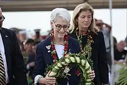 On August 6, 2015, Kennedy accompanied US Under Secretary of State for Arms Control and International Security Rose Gottemoeller to the memorial for the atomic bombing of Hiroshima, Japan by the United States in World War II. It marked the 70th anniversary of the bombing, and Gottemoeller became the first senior American official to attend the annual memorial.[113] Kennedy was only the second US ambassador to attend. With representatives of 100 countries in attendance, Japanese prime minister Shinzō Abe reiterated Japan's official support for the abolition of nuclear weapons.[114]