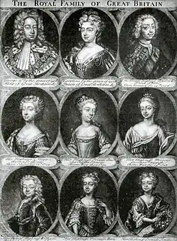 George Augustus and Caroline had a successful and loving marriage, though he continued to keep mistresses, as was customary for the time.[22] Caroline was aware of his infidelities; they were well known and he told her about them himself. His two best-known mistresses were Henrietta Howard, later Countess of Suffolk, and, beginning in 1735, Amalie von Wallmoden, Countess of Yarmouth. Howard was one of Caroline's Women of the Bedchamber and became Mistress of the Robes when her husband inherited a peerage in 1731; she retired in 1734.[23] In contrast with George Augustus and his mother, Sophia Dorothea, Caroline was known for her marital fidelity; she never made any embarrassing scenes nor did she take lovers.[22] She preferred her husband's mistresses to be her ladies-in-waiting so that she could keep a closer eye on them.[24]