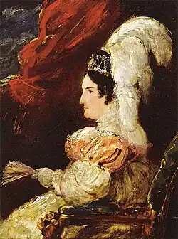 The previous year, Caroline's daughter, Princess Charlotte, had married Prince Leopold of Saxe-Coburg-Saalfeld, and the future of the British monarchy looked bright. Then tragedy struck: in November 1817, Charlotte died after giving birth to her only child, a stillborn son. For the most part, Charlotte had been immensely popular with the public, and her death was a blow to the country.[69] George refused to write to Caroline to inform her, leaving it for their son-in-law Leopold to do, but Leopold was deep in grief and delayed writing. George did, however, write to the Pope of the tragedy, and by chance the courier carrying the letter passed by Pesaro, and so it was that Caroline heard the devastating news.[70] Caroline had lost her daughter, but she had also lost any chance of regaining position through the succession of her daughter to the throne.[71]