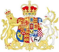 The royal coat of arms of the United Kingdom are impaled with her father's arms as Duke of Brunswick. The arms were Quarterly of twelve, 1st, Or, a semé of hearts Gules, a lion rampant Azure (Lüneburg); 2nd, Gules, two lions passant guardant Or (Brunswick); 3rd, Azure, a lion rampant Argent crowned Or (Eberstein); 4th, Gules a lion rampant Or, within a border componé Argent and Azure (Homburg); 5th, Or, a lion rampant Gules crowned Azure (Diepholz); 6th, Gules, a lion rampant Or (Lauterberg); 7th, Per fess, in chief Or, two bears' paws erect Sable (Hoya), in the base a gyronny, Argent and Azure (Old Bruckhausen); 8th, Azure, an eagle displayed Argent, langued, beaked and membered Gules (Diepholz eagle); 9th, Chequy Argent and Gules (Hohnstein); 10th, Argent, a stag's attire in bend Gules (Regenstein); 11th, Argent, a stag trippant Sable (Klettenberg); 12th, Argent, a stag's attire in bend sinister Sable (Blankenburg).[107][108]