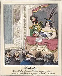 Modesty!, etching published by G. Humphrey, London, 1821: Caroline of Brunswick, at a theatre in Genoa, with her secretary and constant companion Bartolomeo Pergami
