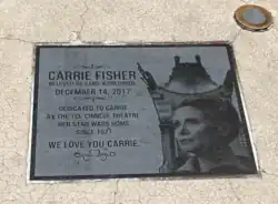 In the absence of a star for Fisher on the Hollywood Walk of Fame after her death, fans created their own memorial using a blank star. Along with flowers and candles, words put on the blank star read, "Carrie Fisher / May The Force Be With You Always / Hope".[1] Fans also gathered at the Yoda Fountain outside the Lucasfilm offices in San Francisco.[162] In June 2021, it was announced that Fisher would receive an official star on the Hollywood Walk of Fame in 2022. She received the star on May 4, 2023, which was Star Wars Day.[12][163]