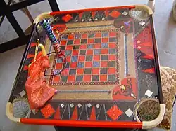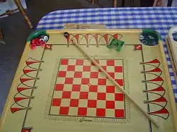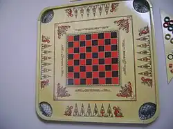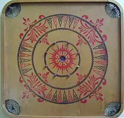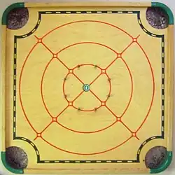 The game of carrom originated in India.[2] One carrom board with its surface made of glass is still present in one of the palaces in Patiala, India.[3] State-level competitions were being held in the different states of India during the early part of the 20th century. Serious carrom tournaments may have begun in Sri Lanka in 1935; by 1958, both India and Sri Lanka had formed official federations of carrom clubs, sponsoring tournaments and awarding prizes.[4]