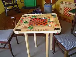 Several companies made copies of Haskell's carrom game board. The Transogram Company made a version in the 1950s and called it Skooker.[21] Coleco made reproductions in the 1980s with names like "Carom-playing Games Board" with up to 202 derived replication games.[21] Some variants in the 1970s were called "101 Games Board" and "Carom-playing 166 Games Board".[21] An ice-box manufacturer made "Combinola" and "Crokinola" variants.[21]