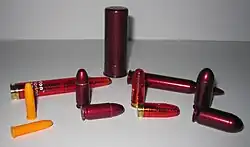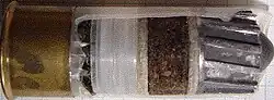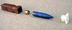 A cartridge,[1][2] also known as a round, is a type of pre-assembled firearm ammunition packaging a projectile (bullet, shot, or slug), a propellant substance (smokeless powder, black powder substitute, or black powder) and an ignition device (primer or percussion cap) within a metallic, paper, or plastic case that is precisely made to fit within the barrel chamber of a breechloading gun, for convenient transportation and handling during shooting.[3] Although in popular usage the term "bullet" is often used to refer to a complete cartridge, the correct usage only refers to the projectile.