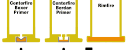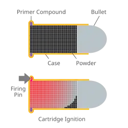 Cartridges can be categorized by the type of primer, which is a small charge of an impact-sensitive explosive compound located: