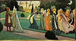 An important episode in Casimir's youth was his stay at the Buda court on a diplomatic mission around 1329/1330. There, he became involved in a romance with Klára Záh, the daughter of the Hungarian magnate Felician Záh.[8] Klara's father learned of the affair only after Casimir had left Hungary. Seeking revenge for the dishonor brought upon his daughter, and accusing Queen Elizabeth, Casimir's sister, of complicity, he burst into Buda Castle during a royal feast and attacked the royal couple, wounding the king and cutting off the queen's fingers. Zach was killed on the spot, and his family suffered severe repressions.[9]